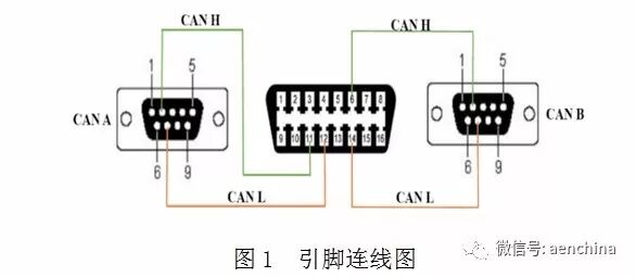 测试系统只需连接车体CAN总线,即可处理车体高速和低速CAN总线的有用信息,实现车体状态的检测。根据测试车辆的OBD接口定义,它们分别分为两个CAN,CAN A和CAN B,第6和第14个引脚为CAN A通道。第11引脚和第12引脚为CAN B通道,并且第6引脚和第14引脚为高速CAN High,第14引脚和第12引脚为低速CAN Low,引脚连线如图1,引脚定义如表1。